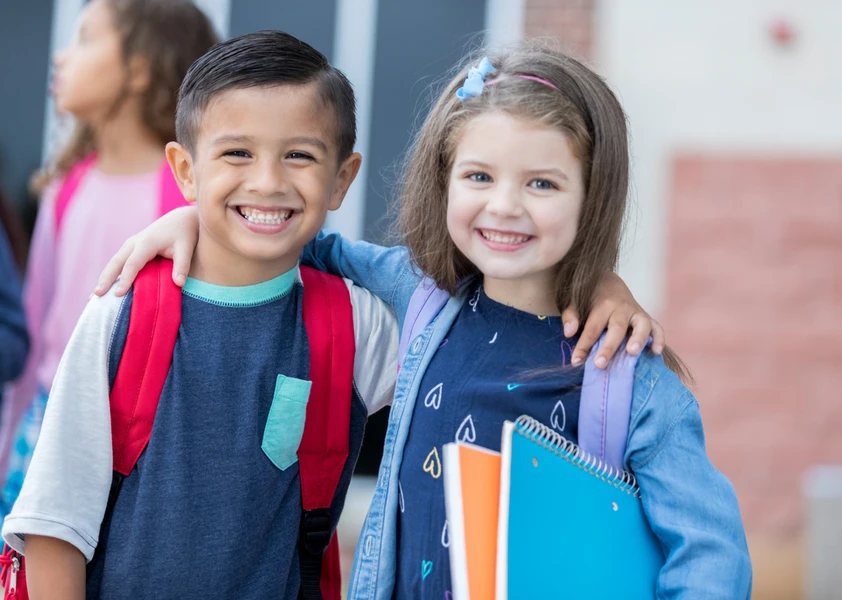 Portrait d'un élève souriant d'école primaire, sac à dos à l'extérieur, à l'école